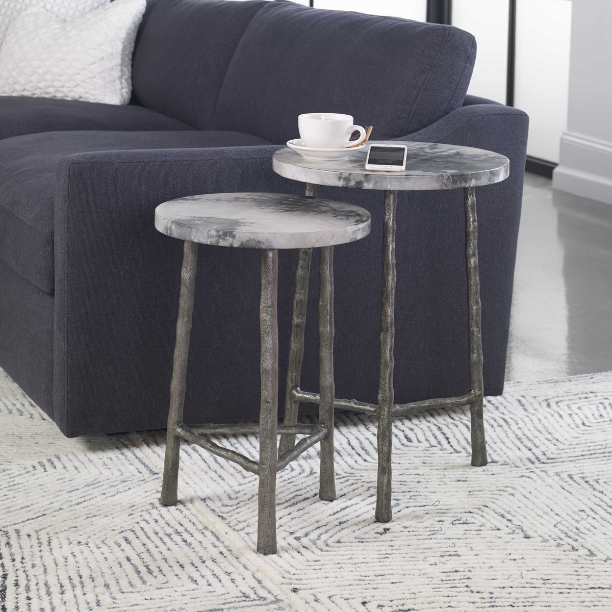 Эти элегантные столы Evie, предназначенные как для индивидуального использования, так и для расположения в паре, обладают столешницей из натурального пергамента в мраморно-серых оттенках. Их прочные чугунные основания, созданные в виде естественных ветвей, подчеркивают их оригинальный дизайн.
