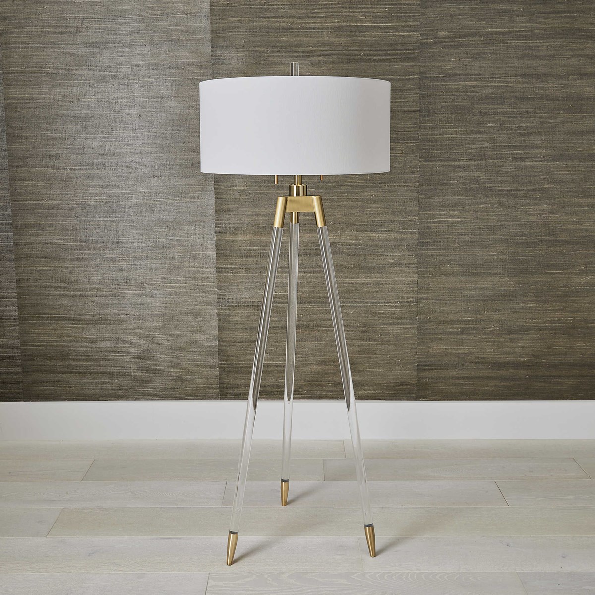 Представляем вам утонченное освещение в стиле штатива - торшер Jonet. Его элегантный дизайн включает в себя прозрачные акриловые ножки с матовыми латунными крышками и координацию с акцентами. Круглый абажур в твердом переплете выполнен из белой льняной ткани, придающей светильнику особый шарм и создающей уют в любом помещении.